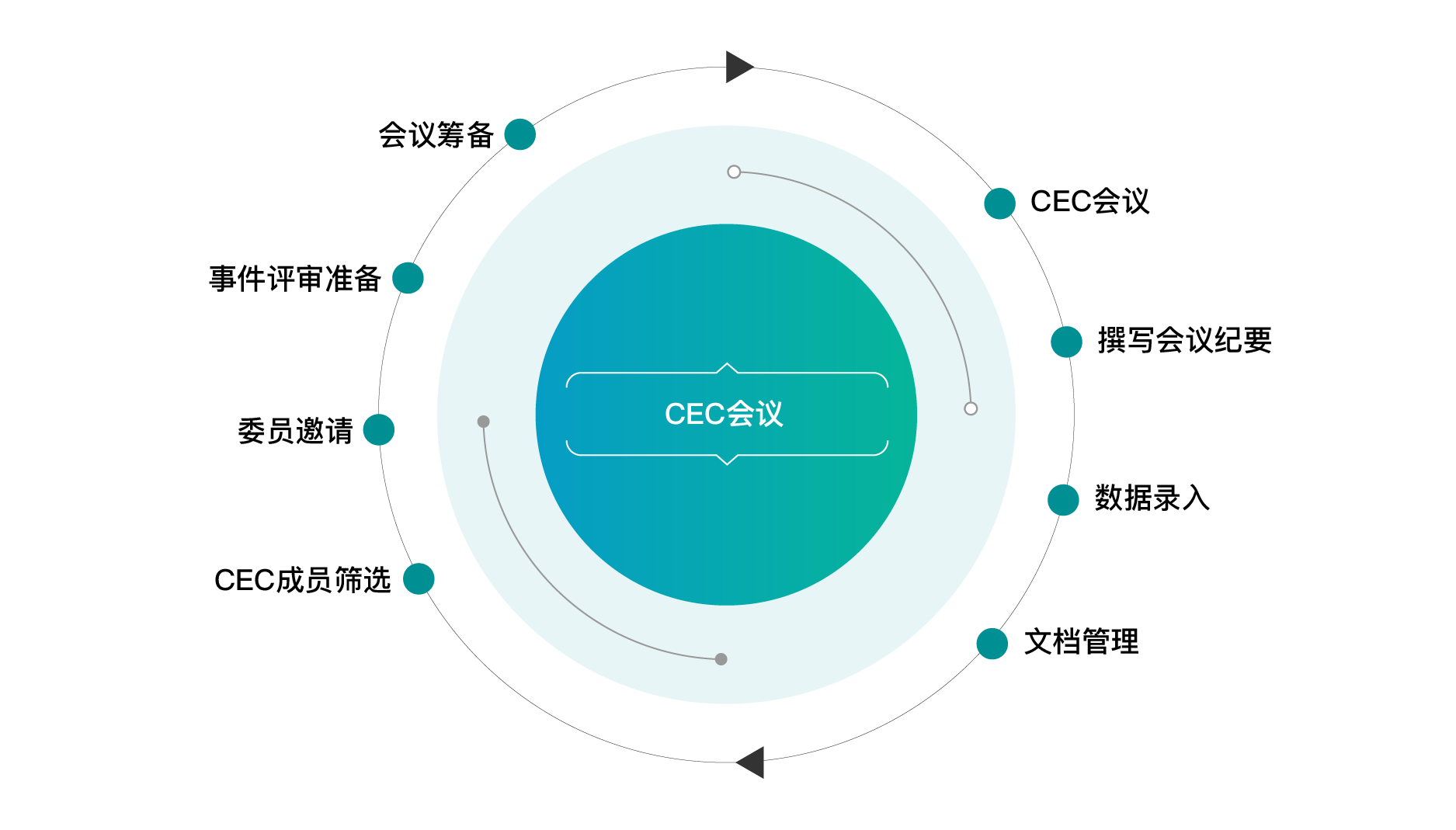 CEC流程:CEC成员筛选 > 委员邀请 > 事件评审准备 > 会议筹备 > CEC会议 > 撰写会议纪要 > 数据录入 > 文档管理