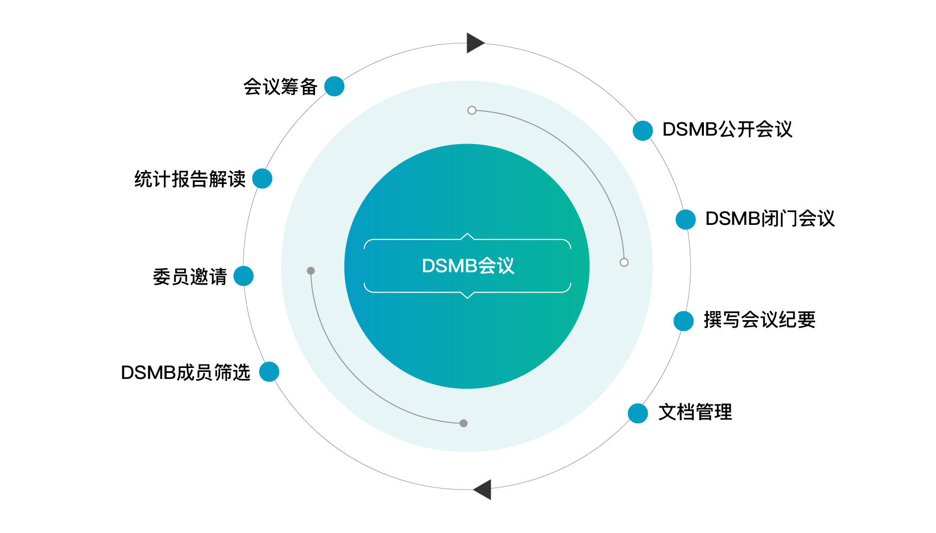DSMB流程:DSMB成员筛选 > 委员邀请 > 统计报告解读 > 会议筹备 > DSMB公开会议> DSMB闭门会议 > 撰写会议纪要 > 文档管理