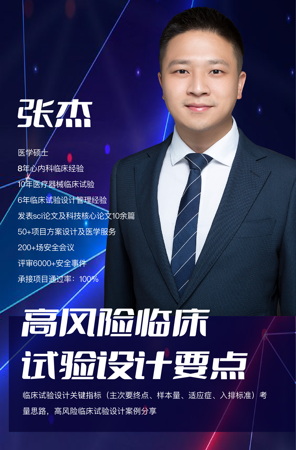 首先由永铭医学高级医学经理张杰先生向大家分享了关于高风险临床试验的设计要点及重点案例解析,他强调医疗器械临床试验方案设计需要从临床应用、统计学、法规符合性、实际操作的可行性等多角度去考虑和完善,方案应不仅对评价指标和受试人群的合理选择、样本量、控制偏倚的方式等进行明确,还应充分考虑试验过程的质量控制和可追溯性。